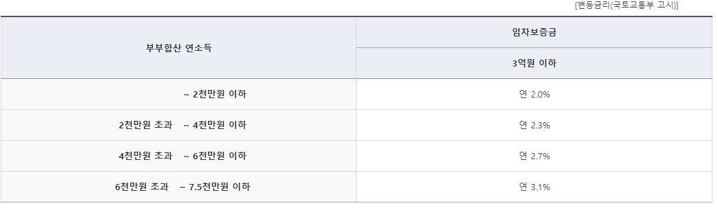 - 청년가구(만 25세 미만, 전용면적 60㎡이하, 보증금 3억 원 이하, 대출금 1.5억 원 이하 단독세대주) 연 0.3%